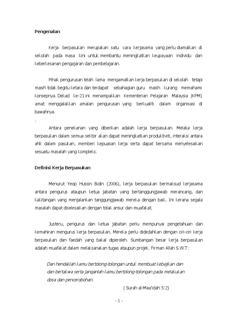 BERDASARKAN KATA SEPAKAT DAN PERSETUJUAN 2. Ada banyak kemahiran kerja berpasukan yang perlu diterokai seperti komunikasi dalam pasukan membuat keputusan beramai-ramai mengendalikan konflik membina kreativiti kepemimpinan memotivasikan membuat penilaian memberi. Kerja berkumpulan boleh dikenali sebagai Team Work atau Kerja Berjemaah.